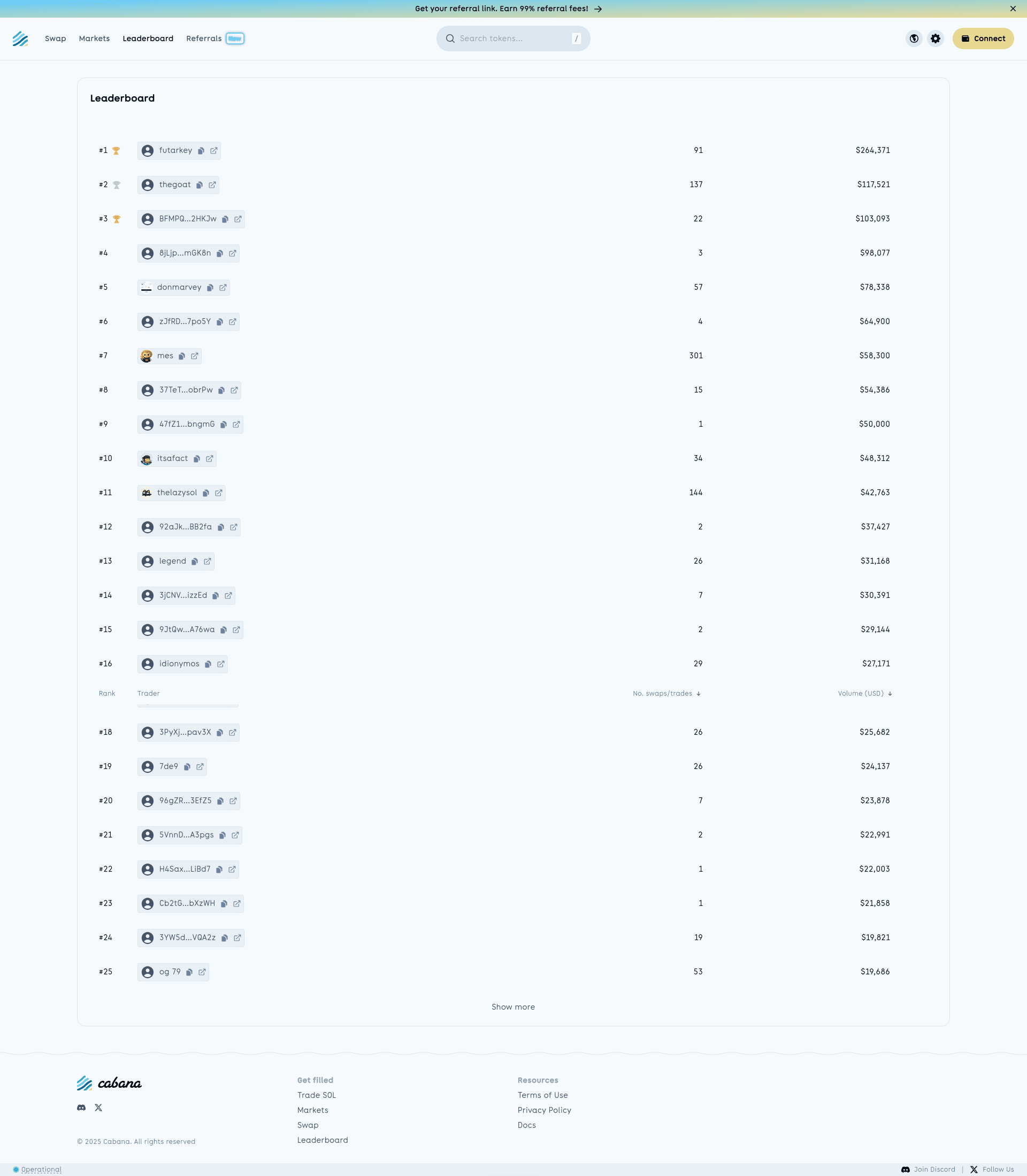 The Leaderboard showcases top-performing addresses based on volume metric within the Cabana platform.